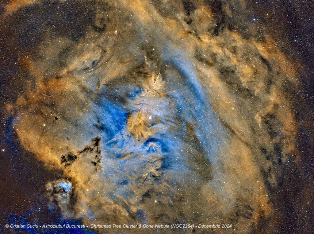 NGC 2264  se află la ~ 2350 de ani-lumină faţă de Terra în constelaţia Monoceros. NGC 2264 include atât roiul Christmas Tree cât și Cone Nebula. Roiul a fost descoperit în ianuarie 1784 de către William Hershel
